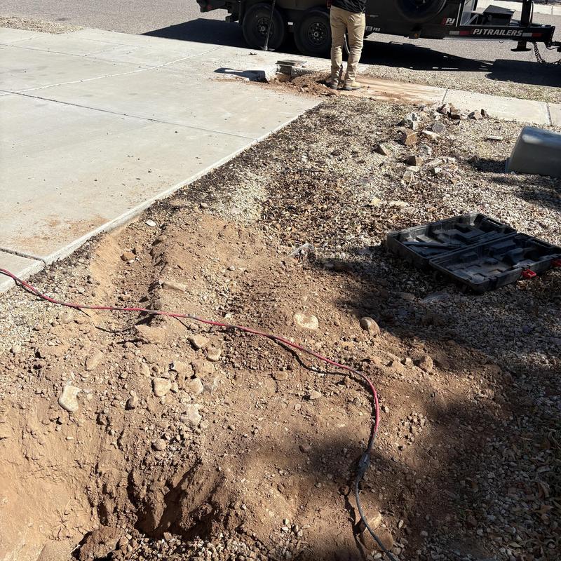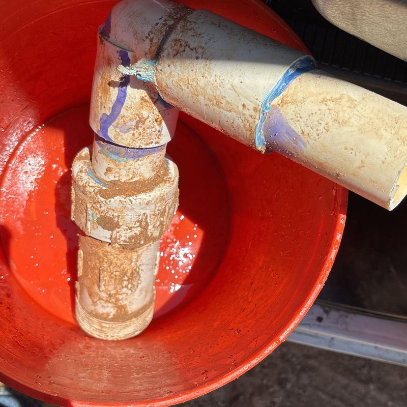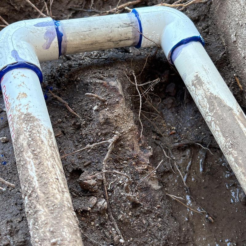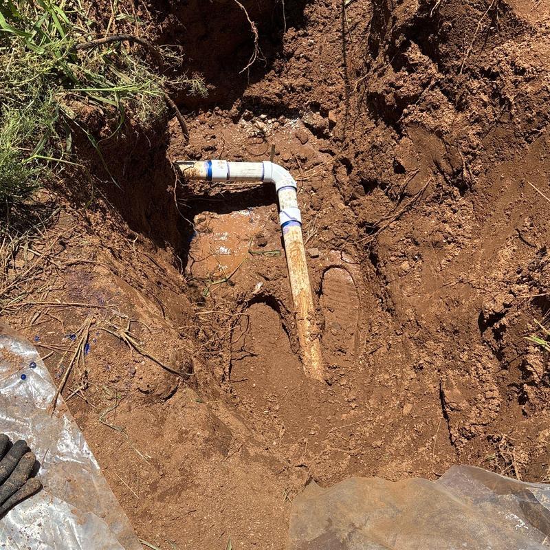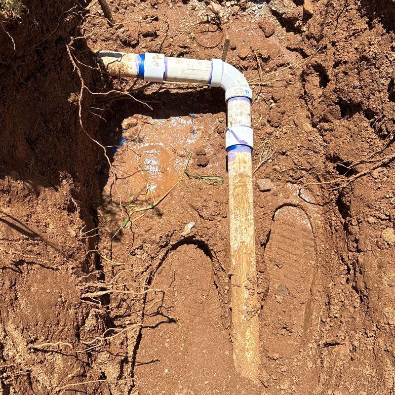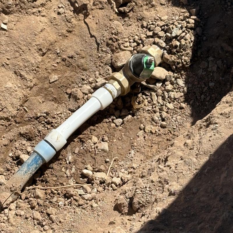 Alpha Rooter and Plumbing repaired a leaking PVC pipe in Tucson, Arizona. The team located the damaged 1.5-inch corner fitting, excavated the area, and replaced it using two couplings and a 90-degree PVC elbow. They will return to complete backfilling.