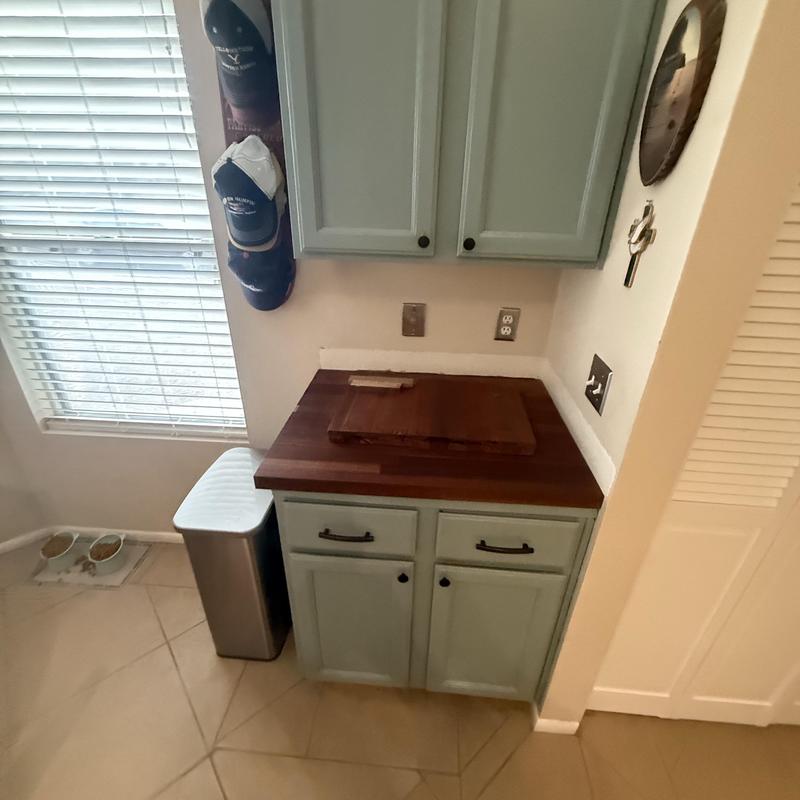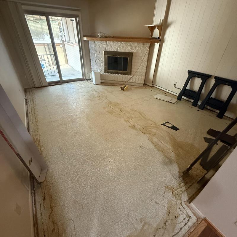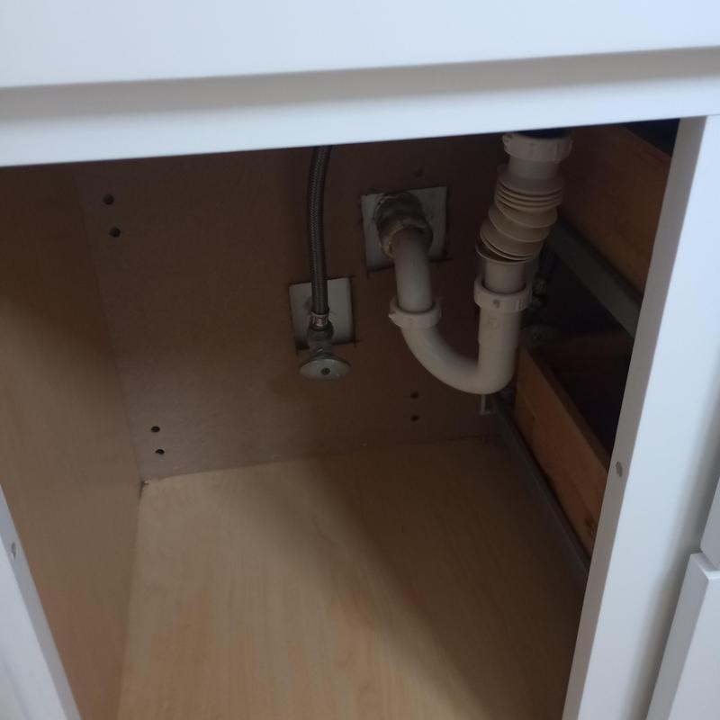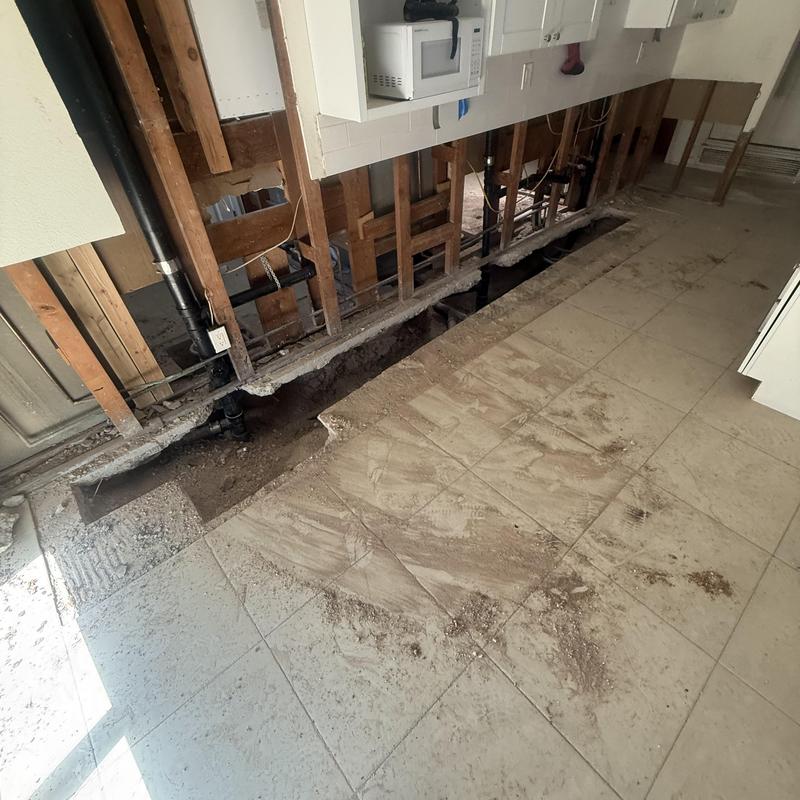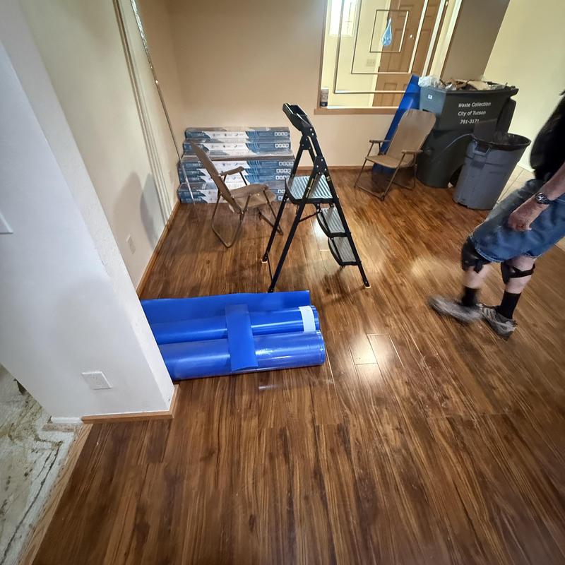 Alpha Rooter and Plumbing trimmed existing laminate flooring to align with cabinet bases in Tucson, Arizona. The team replaced visible floor areas with new planks while leaving laminate beneath the cabinets untouched to preserve structural integrity and reduce material use.