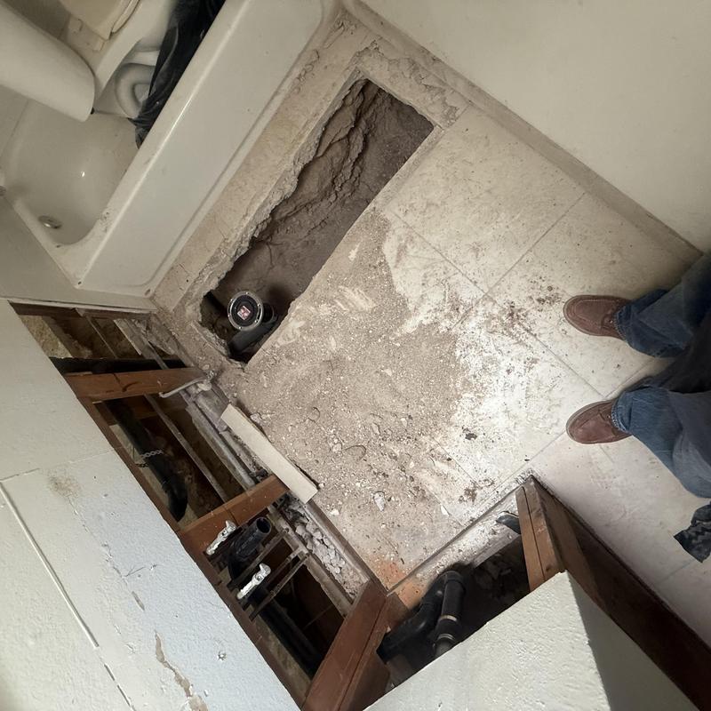 Alpha Rooter and Plumbing assessed a residential bathroom remodel in Tucson, Arizona. The homeowner requested help removing a solid concrete shower base and relocating the drain. The technician evaluated the site and will provide a cost estimate for the jackhammer work and plumbing adjustments.