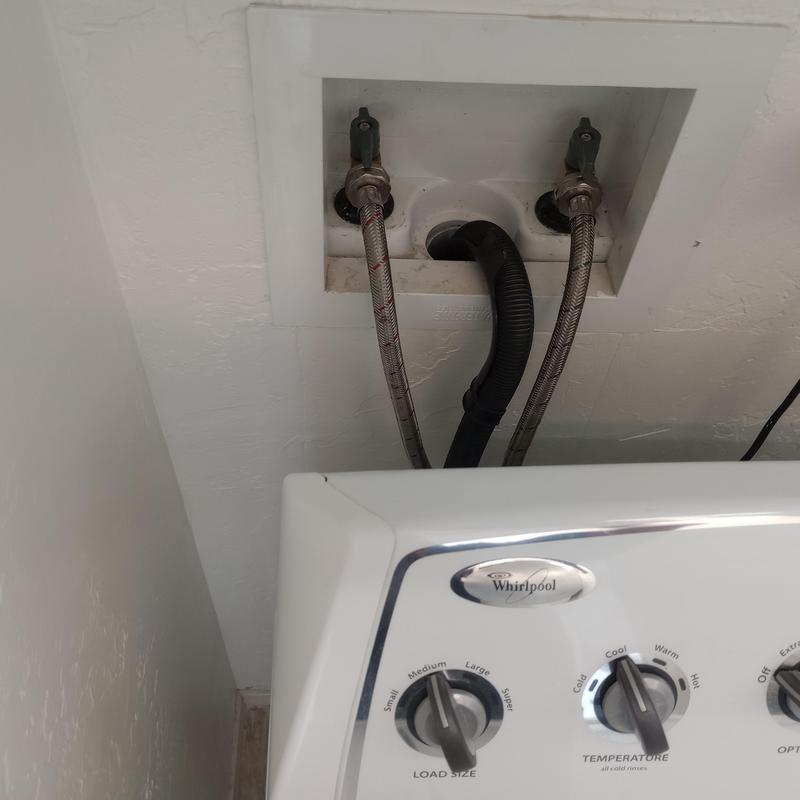 A plumber in Sahuarita, Arizona inspected a washer box for leaks. They tested the hot and cold water valves and drain lines by running hoses and monitoring for drips. All components, including the P-trap and ABS drain line connections, showed no signs of leakage. The washer box and plumbing were confirmed to be secure.