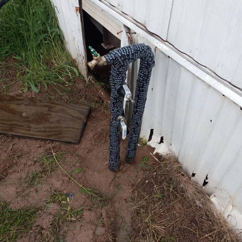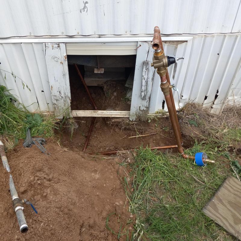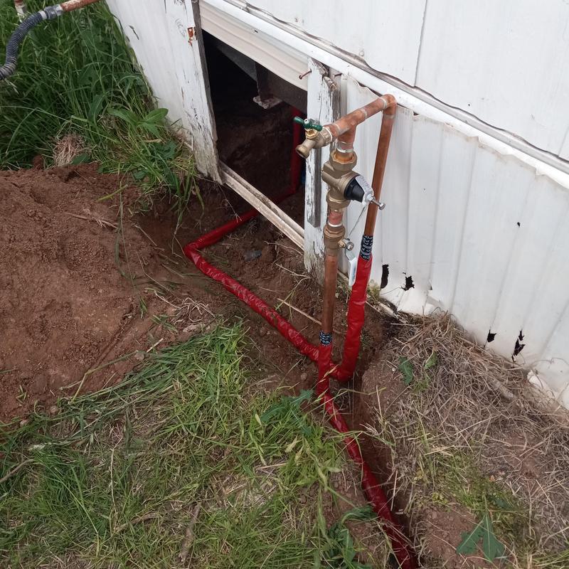 ALPHA Rooter and Plumbing replaced a broken main water supply line for a mobile home in Benson, Arizona. The team trenched the backyard, installed a new one-inch PEX line from the meter, added a new pressure regulator, and connected the system back to the home. All components were tested with no leaks confirmed.